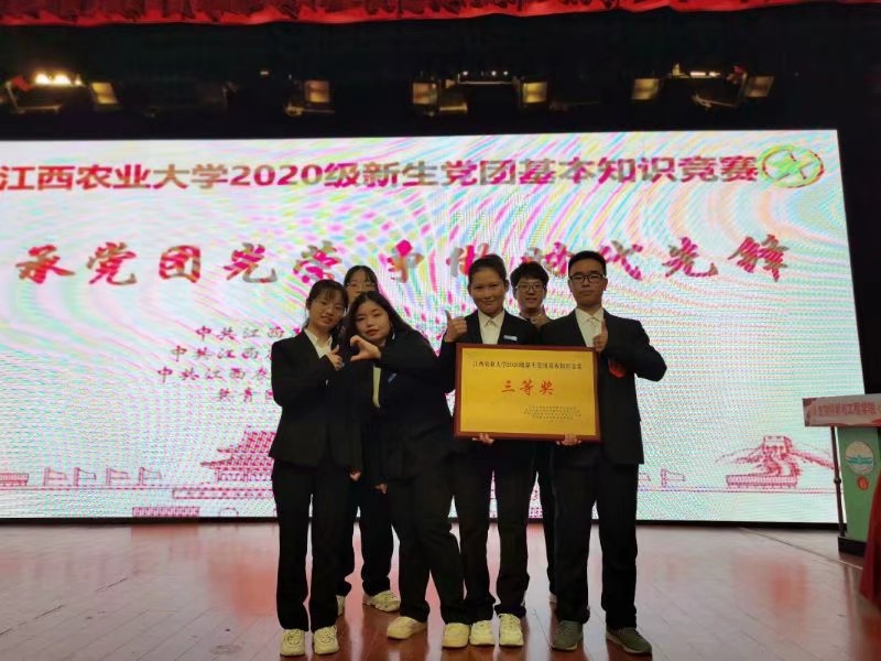 由中共江西农业大学委员会组织部、中共江西农业大学委员会学生工作部、中共江西农业大学委员会研究生工作部、共青团江西农业大学委员会主办的“传承党团光荣 争做时代先锋”江西农业大学2020级新生党团基本知识竞赛决赛于12月16日晚7点在逸夫报告厅顺利举行,我院马梦羽、王雅琪、龚茜雯、周茜亭、徐鹏、陈凌峰同学代表学院参赛并获第四名、三等奖。