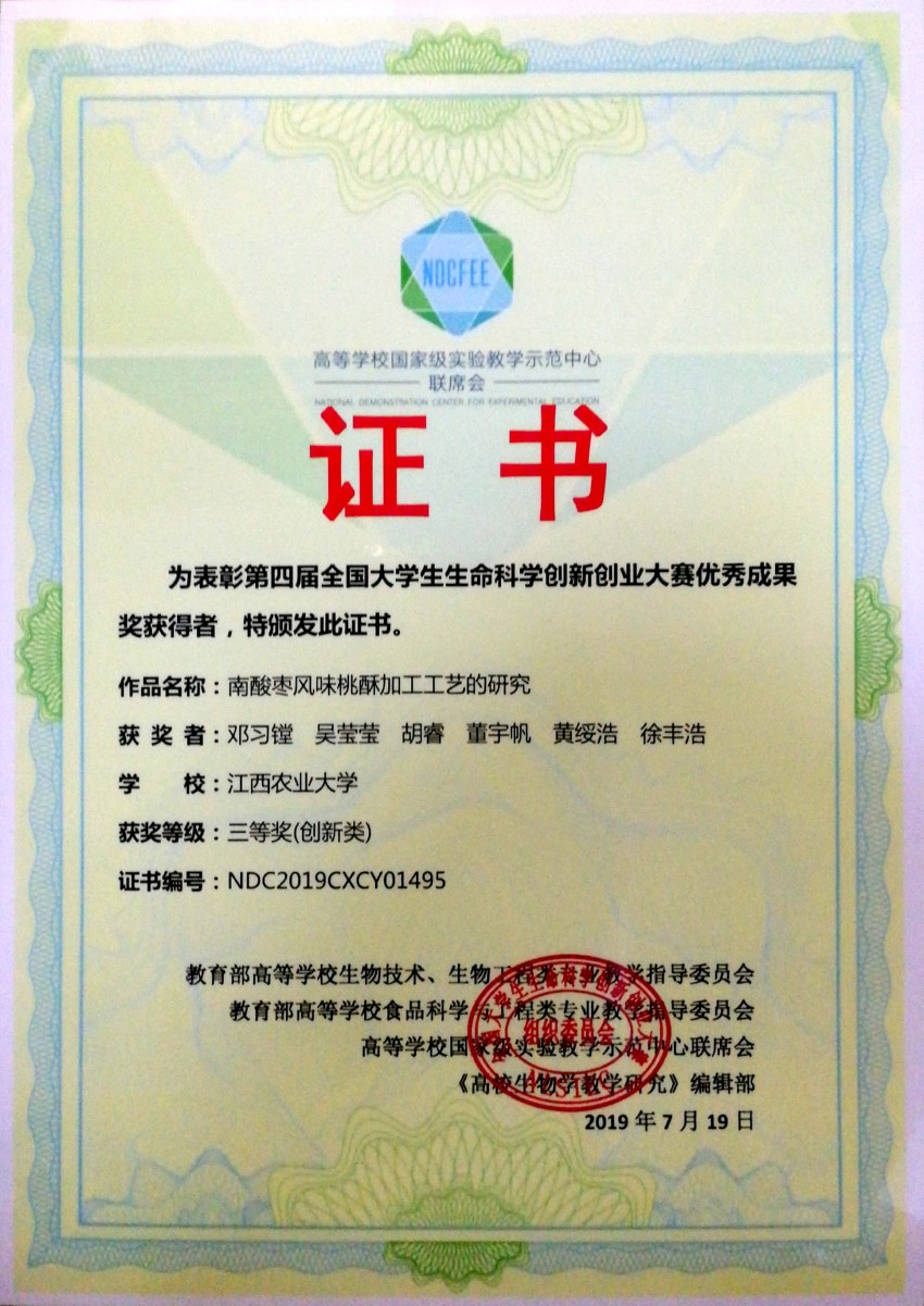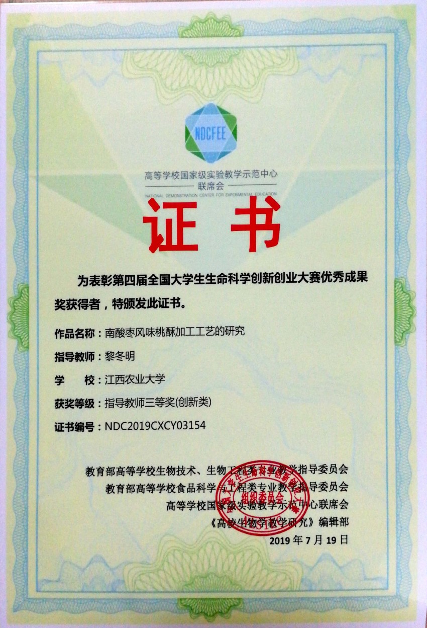 该赛事自1月份启动以来,我院高度重视,精心组织专业教师和学生积极准备作品并参赛。在参赛师生共同努力下,我院黎冬明老师指导邓习镗、吴莹莹、胡睿、董宇帆、黄绥浩、徐丰浩等同学完成的作品《南酸枣风味桃酥加工工艺的研究》获创新类三等奖。